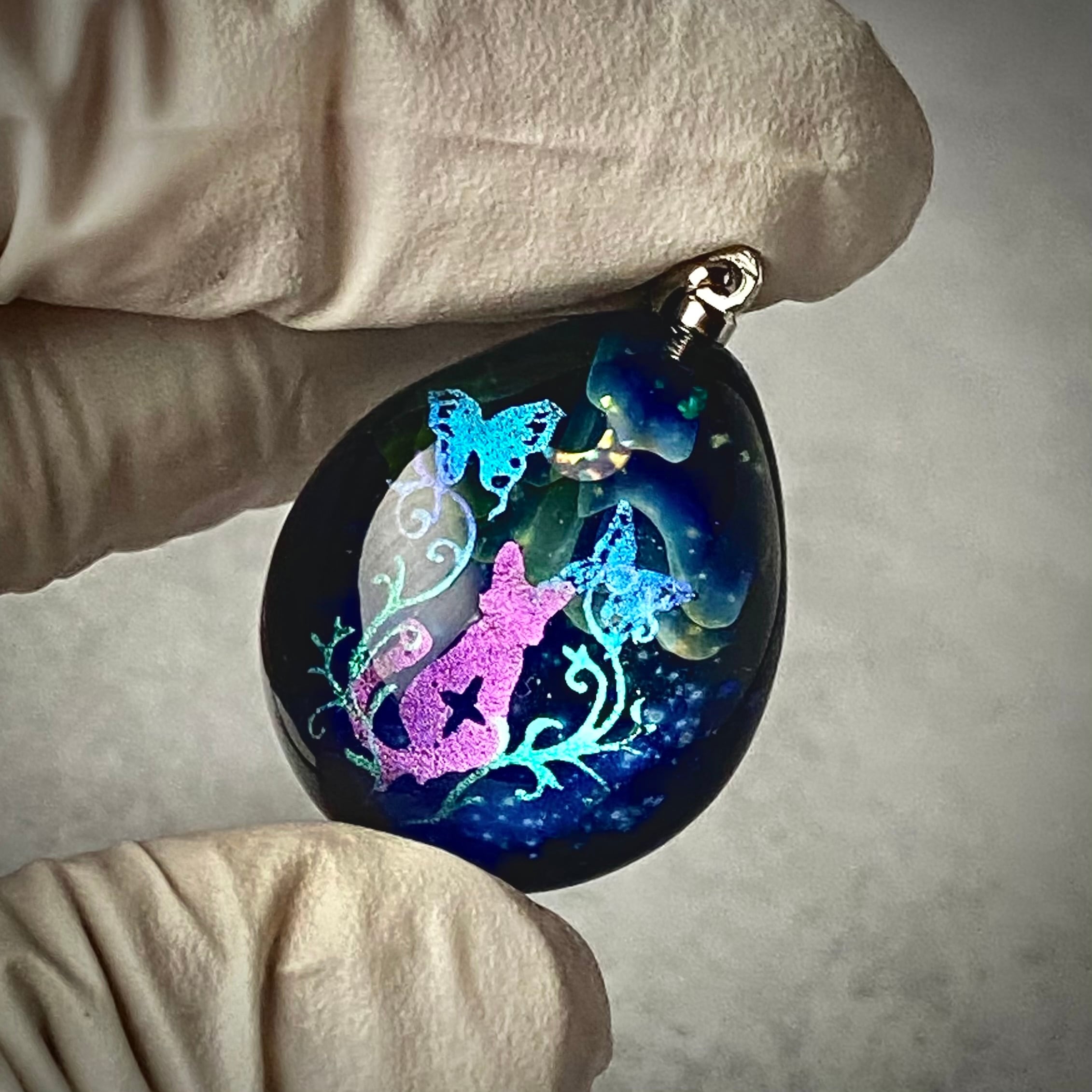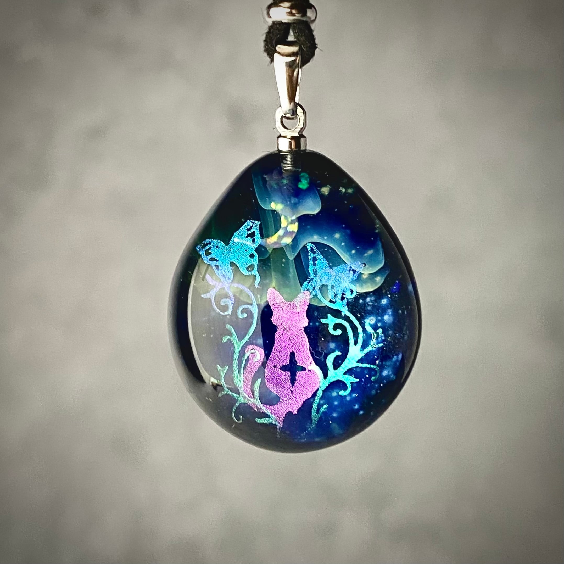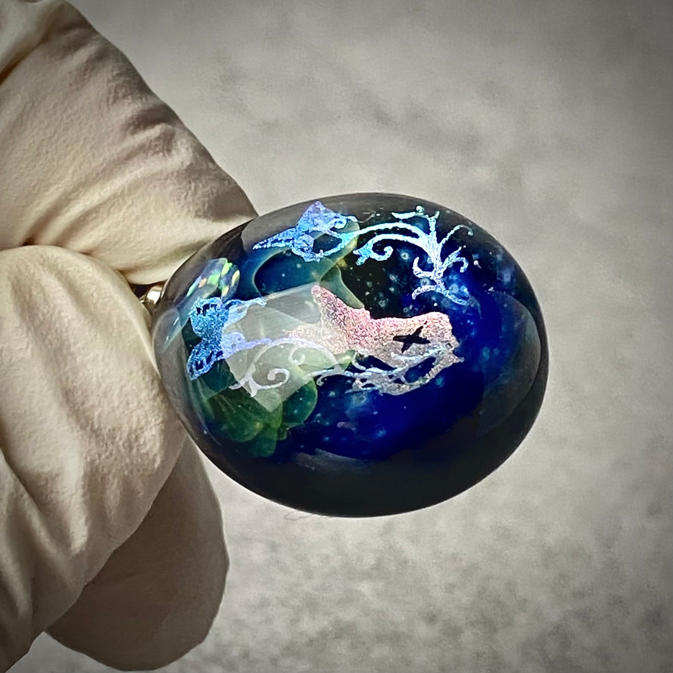 ダイクロという特殊な金属素材や純銀などの貴金属をガラスに蒸着させるフューミング技法などさまざまな技法を組み合わせた作品です。