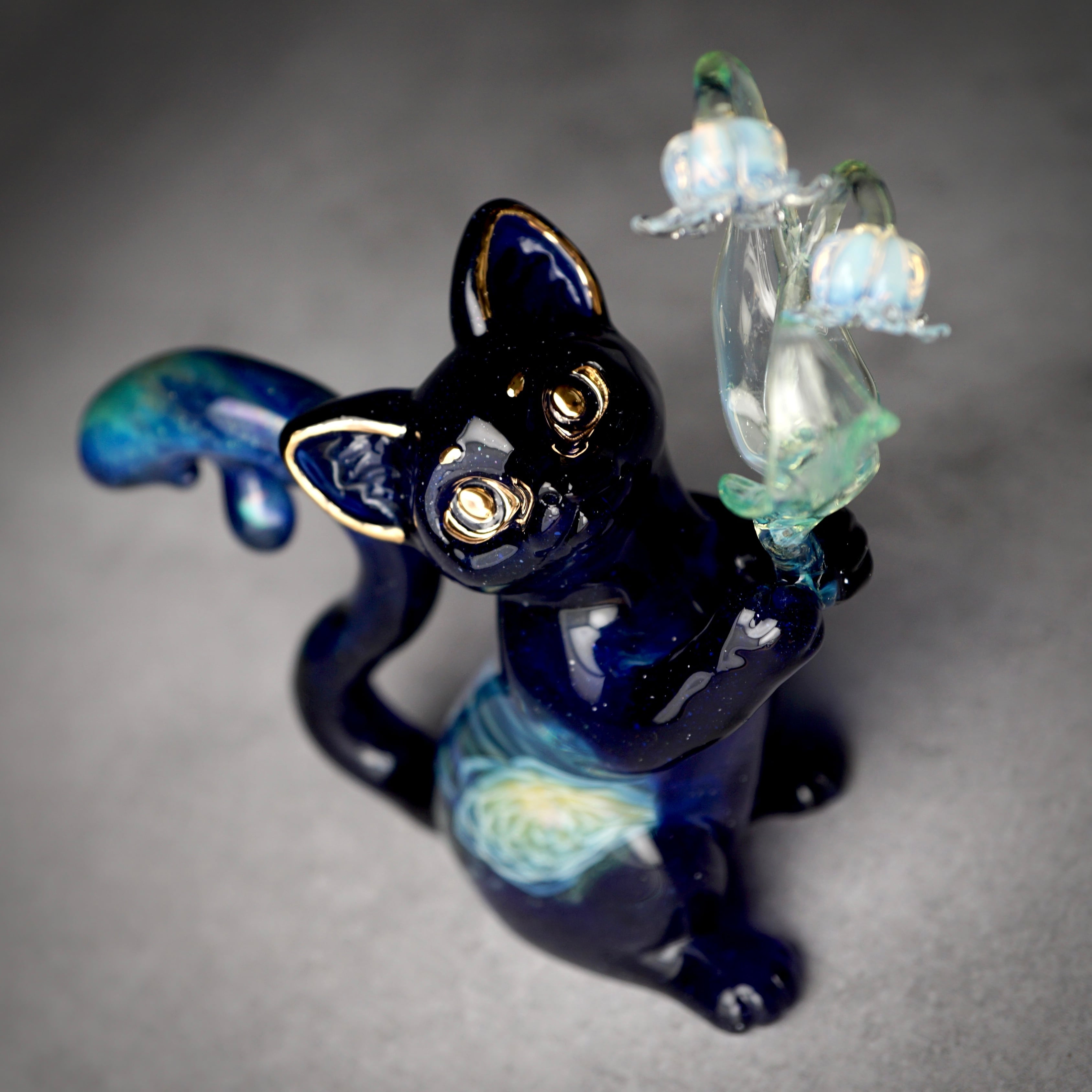 また、純銀を使用した着色技法による深みのある青い夜空と、瞳の金彩仕上げによる輝きとのコントラストがとても神秘的です。