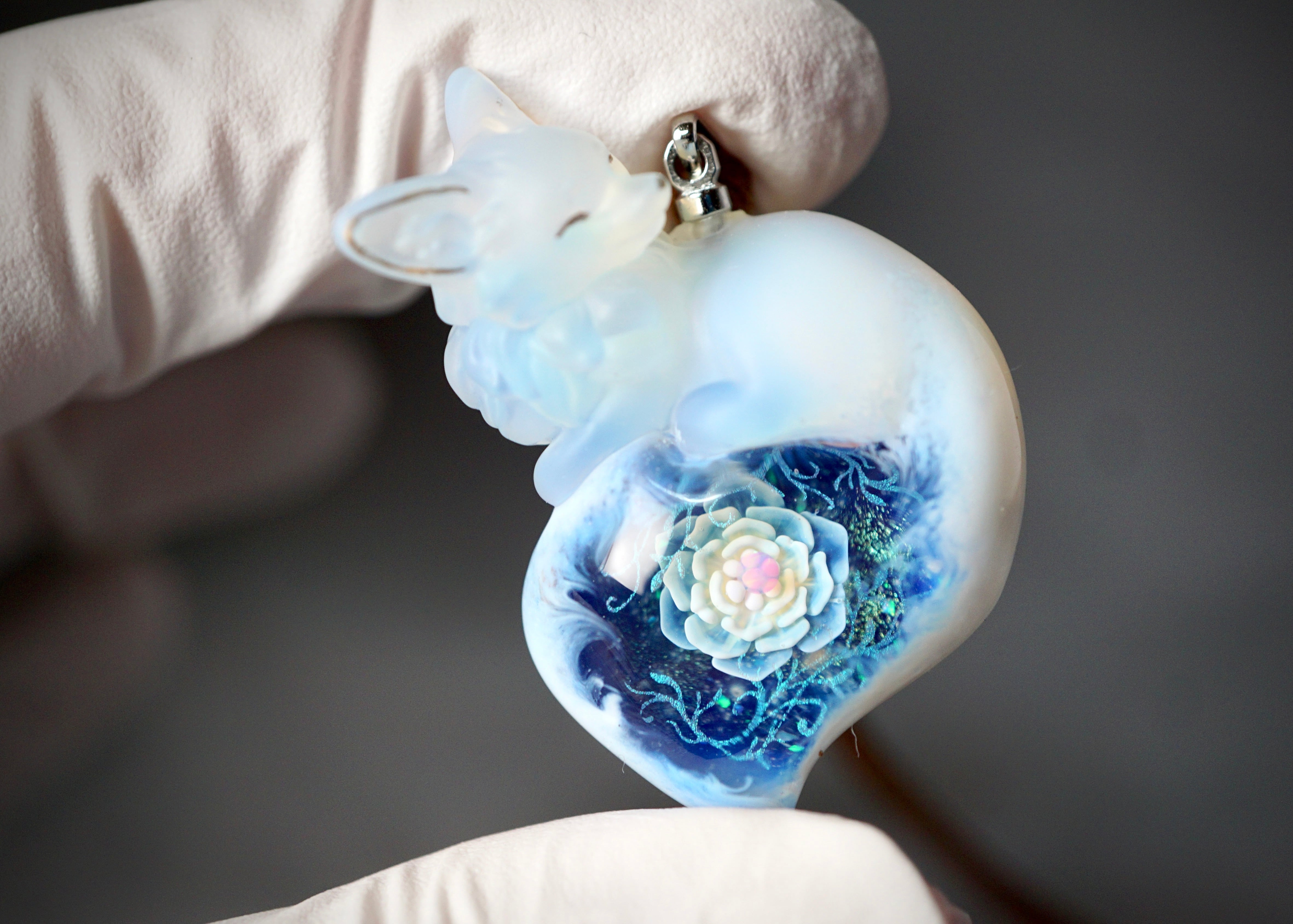 表情やポーズまで細かく作り込んであり、尻尾内部にも繊細な花や輝きのあるダイクロという素材を用いて植物模様を表現しています。