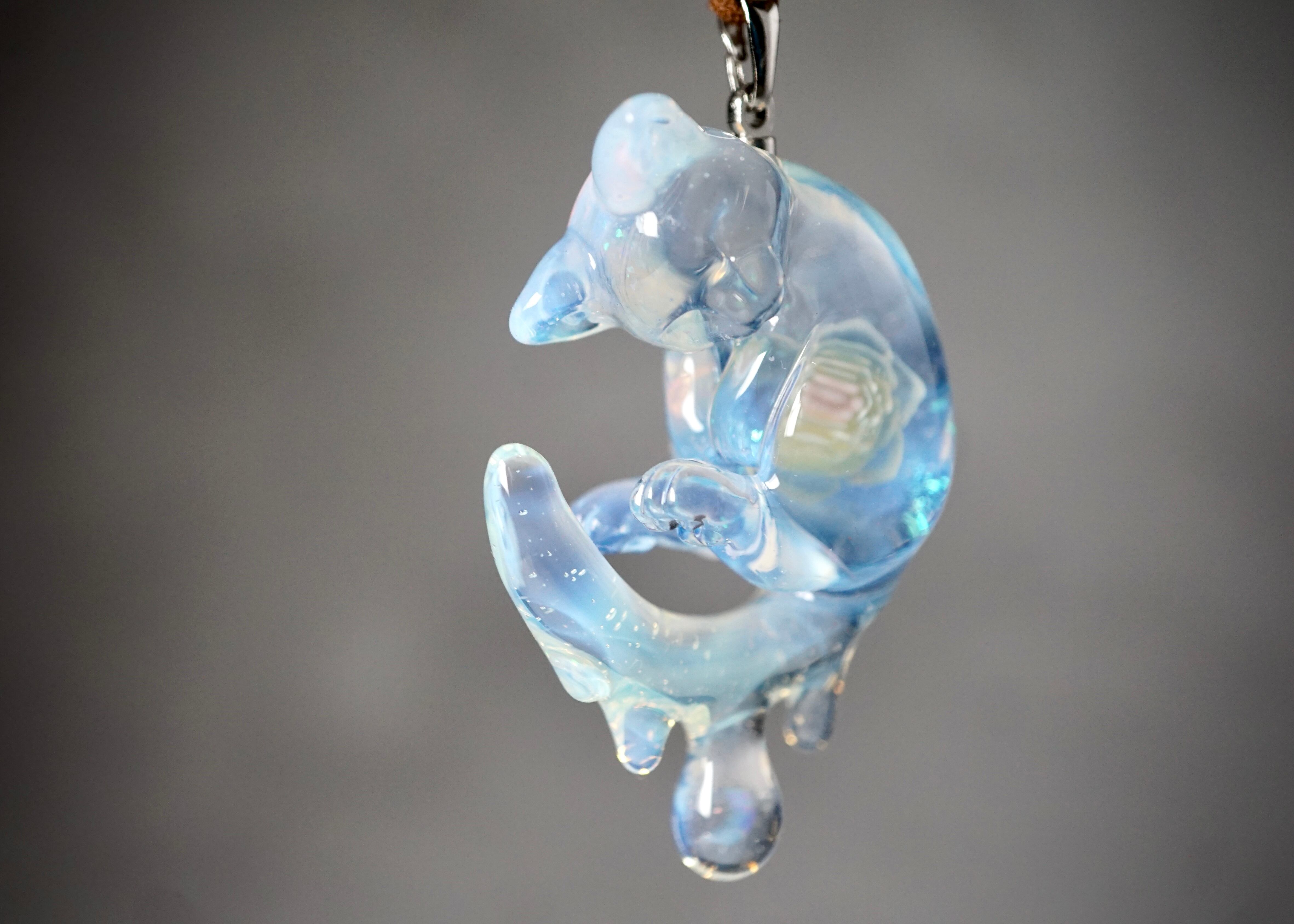 月明かりのような淡いブルーと花が特徴的な猫のペンダントです。